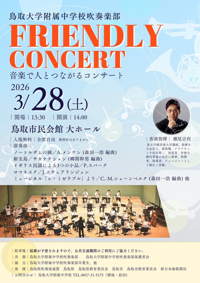 「鳥取大学附属中学校吹奏楽部 FRIENDLY CONCERT〜音楽で人とつながるコンサート」が開催されます(3/28)(とりまね第四号 松岡さん)