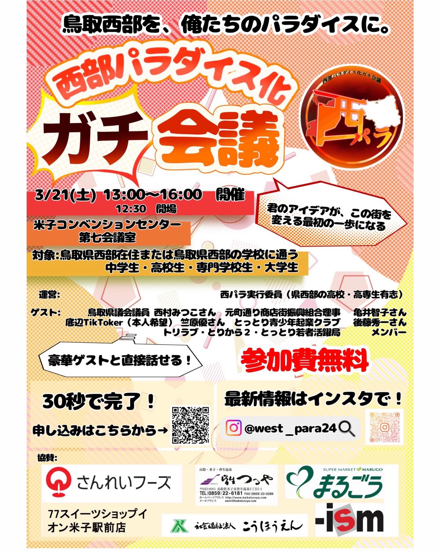 「とりまね」助成第五号のチーム西部パラダイスさんのイベントが開催されます。学生のアイデアで鳥取県西部を盛り上げるイベントです。